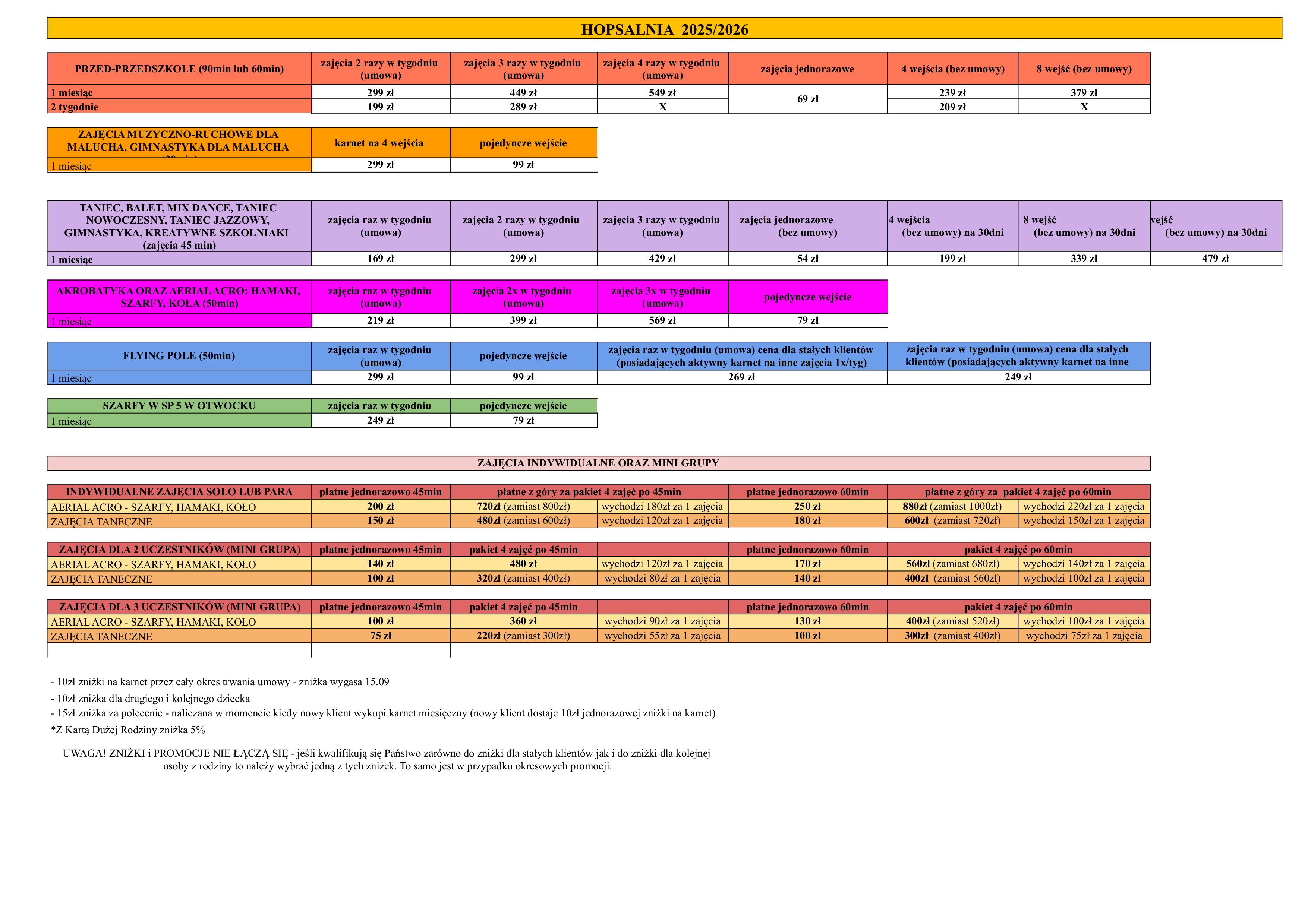 Wszystkie karnety na umowę obowiązują zgodnie z miesiącami kalendarzowymi, np. karnet na miesiąc obowiązuje na cały wrzesień lub cały październik. W przypadku dołączenia do zajęć w środku miesiąca zapraszamy do indywidualnego wyliczenia karnetu (więcej informacji w recepcji Hopsalni).